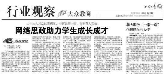 7月5日,大众日报以《网络思政助力学生成长成才》为题刊发报道,介绍山东农业大学主动适应90后大学生学习生活的“网络化”特点,用活信息载体,丰富教育内容,突出育人实效的经验做法。